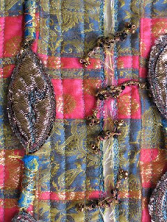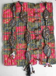 The package from which I made the mini quilt in the pictures, was a selection of very strong coloured sari fabrics. They were so much in your face. I like colour but they were just over the top. After having made a simple strip pieced top, I sandwiched it with wadding, backing and a final overlay of a chiffon scarf on the top to knock the colours back. Then I quilted it. Cut it up, played with joining and embellishing, finishing it of with raw edge stitching. I was really pleased with the result. It was a lot of fun to make. I can highly recommend doing a challenge like this. It is absolutely amazing to look at the different results, having all started from the same base.